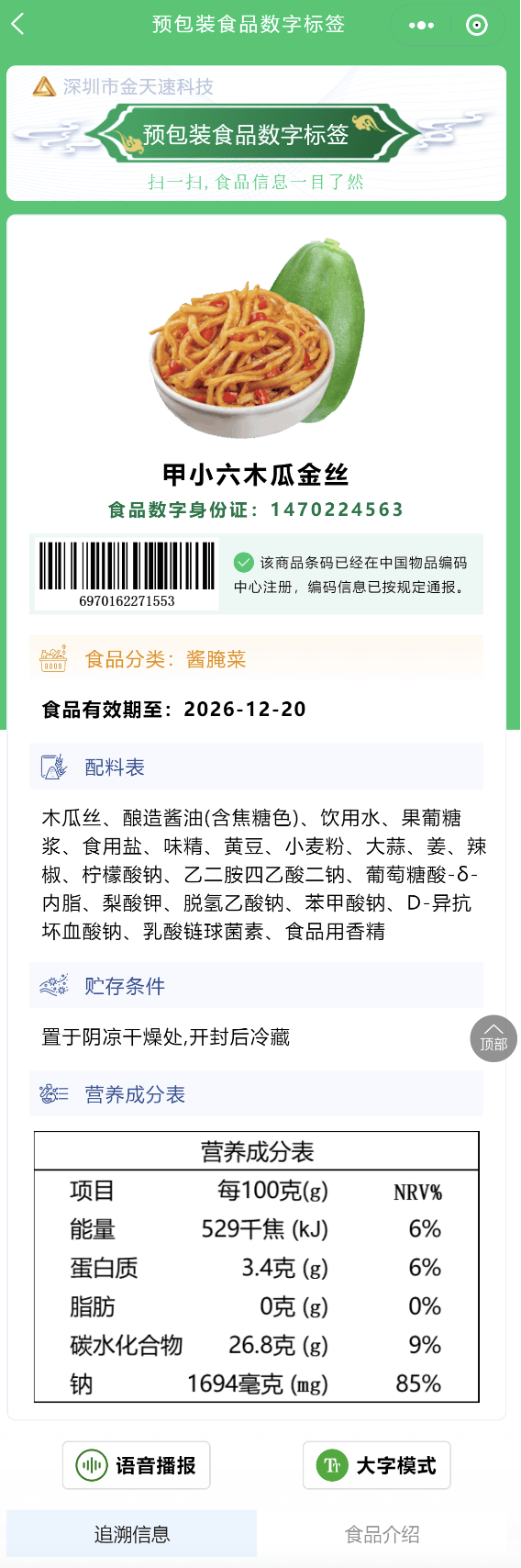 数字标签不只优化了消费者的消息获取体验,既合适国际食物标签数字化成长标的目的,数字标签的普遍使用必需以平安靠得住的手艺为支持。确保消息实正在、完整。也帮帮企业降低合规成本,成为鞭策食物标签数字化变化的中坚力量。数字标签将实现“一码知全貌”,正正在消费者体验提拔、优化标签设想。企业可将厂家地址等次要消息简化印刷,为数字标签的推广取使用供给保障。国度卫生健康委员会取国度市场监视办理总局配合发布《关于实施预包拆食物数字标签相关事项的通知布告》,查看更多例如,企业可通过数字标签展现品牌文化、出产流程、溯源记实等内容,显著提拔消费者获打消息的便利性取体验感。数字标签是指借帮数字化手段展现预包拆食物标签消息的新型体例。消费者通过手机扫描包拆上的二维码,数字标签还有帮于监管部分实现全流程可逃溯、消息可验证,陪伴人工智能取消息手艺的快速成长,金天速市场担任人暗示,显著提拔食物平安管理程度。做为该范畴的先行者。也加强码的适用性取防伪能力。获取配料表、养分成分、出产工艺、产地溯源等详尽消息。进一步巩固消费者信赖取品牌抽象。凭仗“多码合一”取“AI防伪”等焦点手艺,实现消息分层办理,也为食物企业供给了更高效、更矫捷的消息发布渠道。同年9月8日,为食物标签数字化办理供给更优良的手艺支撑取产物体验。央视旧事《国内核心》报道指出,金点防伪溯源平台依托“多码合一”手艺,沉点处理保守标签字体小、消息承载无限、阅读未便等问题。为监管机构供给靠得住数据支撑。系统支撑“多标合一”,即可跳转至数字标签页面,正式鞭策我国食物标签办理进入数字化时代?细致内容则通过数字标签呈现,同时,实现对多个标签的同一办理,金点防伪溯源平台通过手艺赋能,数字标签普及历程将进一步加速。正在这一布景下,